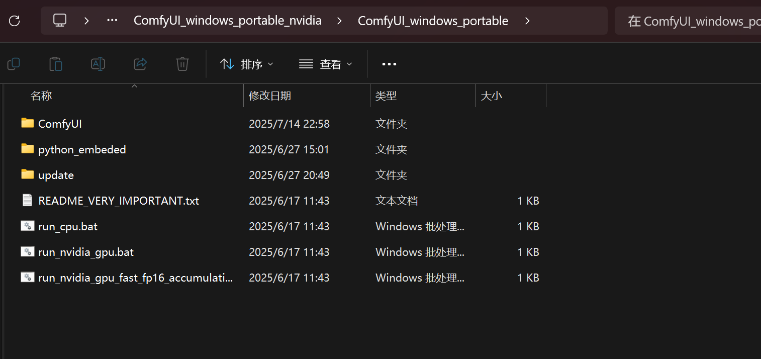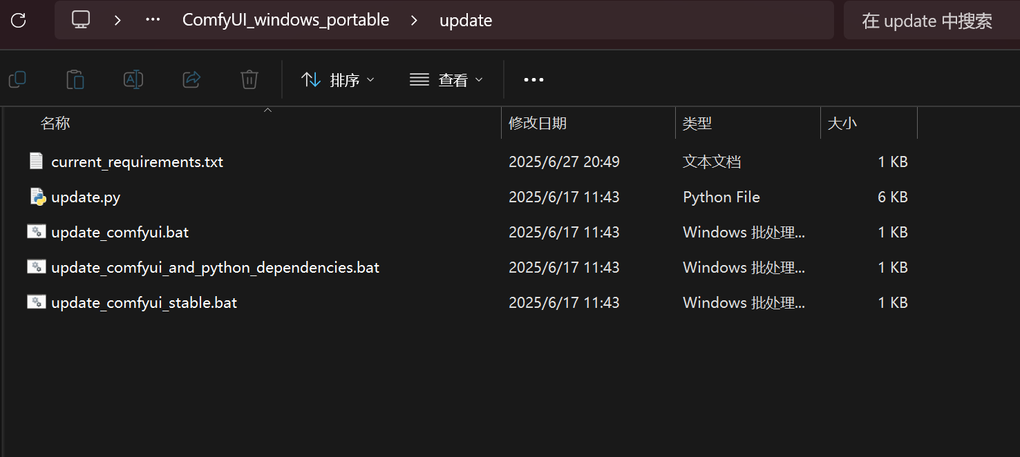进入 Update 文件夹,点击 update_comfyui_and_python_dependencies.bat 升级 ComfyUI 到最新版本。