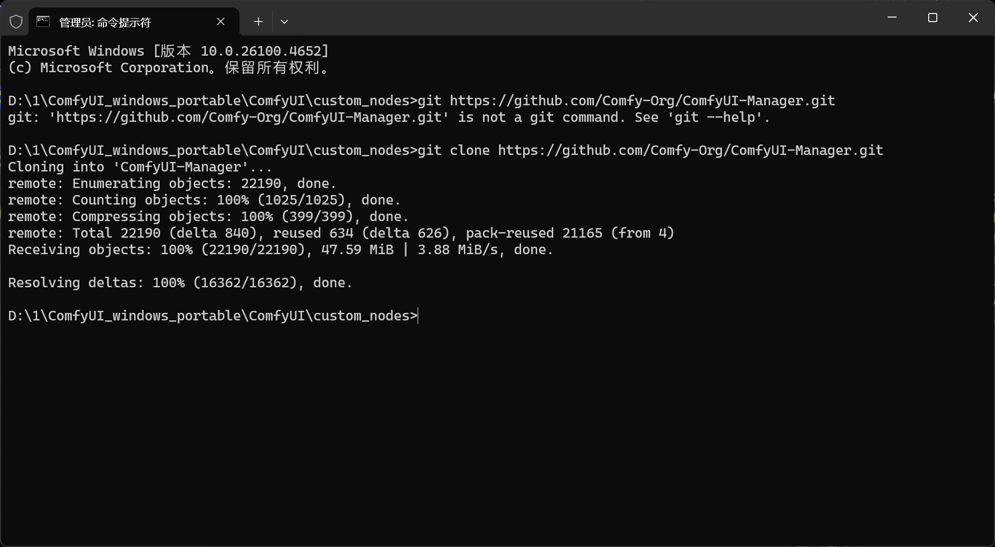 执行操作后输入 git clone https://github.com/Comfy-Org/ComfyUI-Manager.git 克隆节点