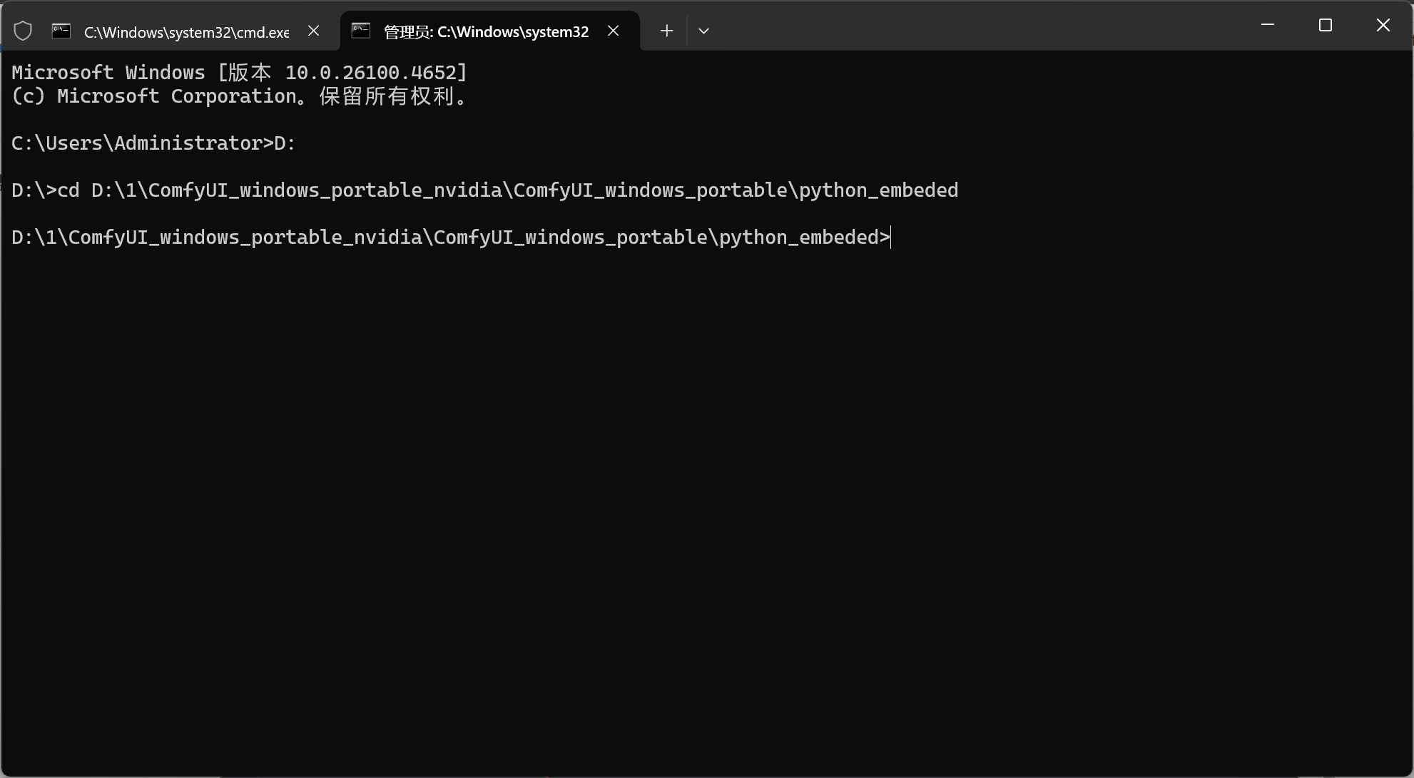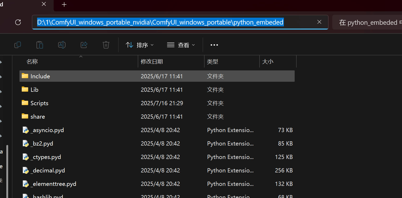 然后进入到你的 ComfyUI的 python_embeded 文件夹,复制你的路径,打开cmd cd到那里进入文件夹