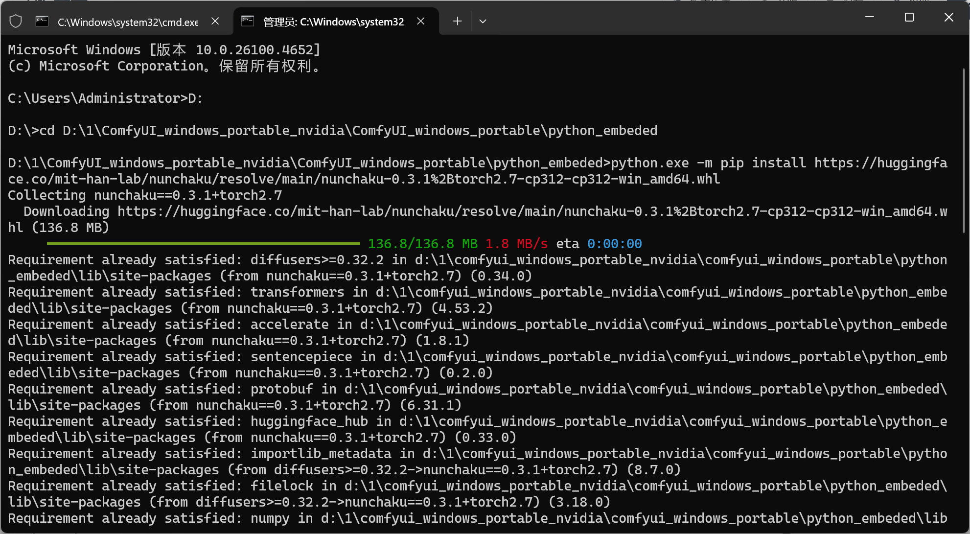输入 python.exe -m pip install https://huggingface.co/mit-han-lab/nunchaku/resolve/main/nunchaku-0.3.1%2Btorch2.7-cp312-cp312-win_amd64.whl 回车,注意魔法打开