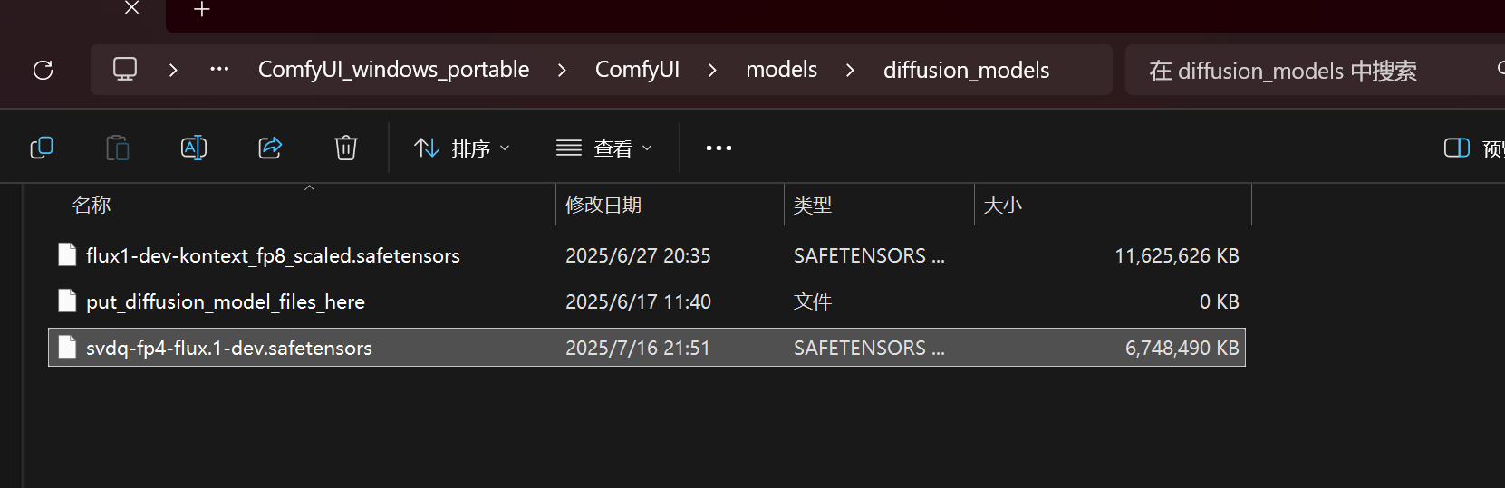 然后将它放到 ComfyUI\models\diffusion_models 文件夹里,如下图