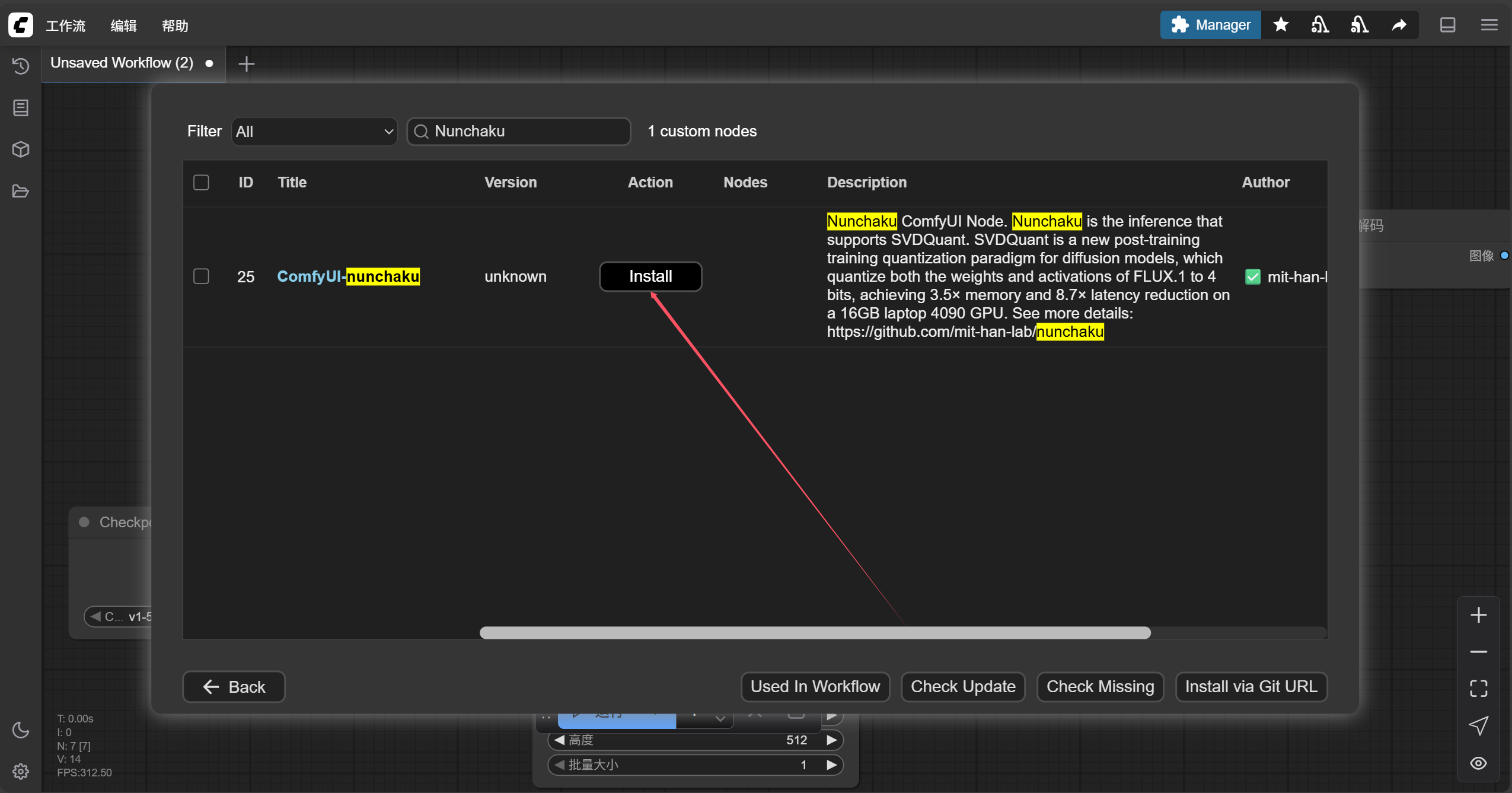 第一步,启动 ComfyUI ,打开Manager 安装插件 Nunchaku 如下图